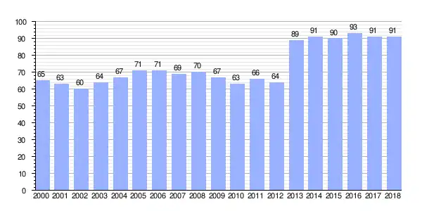 | Gráfica de evolución demográfica de Paramuíño entre 2000 y 2018 |