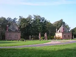 Las pilastras y las cadenas de las esquinas son de piedra almohadillada. El porche-pabellón de dos niveles tiene una bóveda de cañón.
