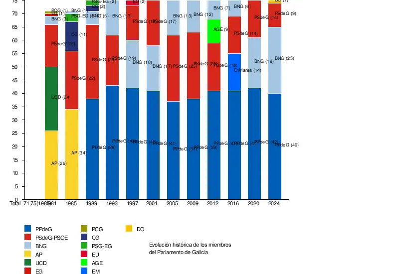 De acuerdo con el artículo 9.1 del Título III de la Ley 8/1985, de 13 de agosto, de elecciones al Parlamento de Galicia,[2] el Parlamento de Galicia está compuesto por 75 diputados. Estos son elegidos por las cuatro circunscripciones electorales gallegas que, a su vez, corresponde con las cuatro provincias de la comunidad autónoma. Cada una de ellas elige a un número diferente de diputados, tal y como marcan los artículos 9.2 y 9.3 de la citada ley: a cada una de las cuatro provincias de Galicia le corresponde un mínimo inicial de 10 Diputados y los 35 diputados restantes se distribuyen entre las provincias en proporción a su población. Actualmente, esta es la distribución de escaños que se sigue:
