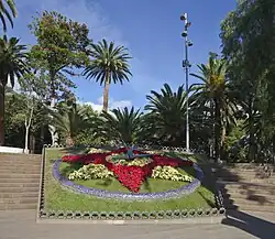 El reloj de flores está flanqueado por dos escalinatas y detrás de él se ve la fuente central. Se caracteriza por estar permanentemente adornado con flores frescas.