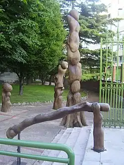Son de destacar las esculturas de madera frente a la entrada principal, las cuales fueron esculpidas con árboles enfermos. Dichas estatuas abstractas son muy conocidas en Palencia.