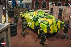 - un aérea de juego táctico-militar para niños usando armas de plástico con proyectiles de gomaespuma del fabricante NERF, un simulador de tanques o una pista para vehículos teledirigidos.