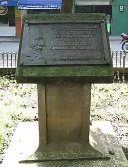 La ciudad de Medellín hace arder aquí la llama de su gratitud para el distinguido ciudadano inglés Mr. Tyrrel Moore quien le hizo cesión gratuita del terreno en donde está ubicado este que él quiso se llamase Parque de Bolívar.
