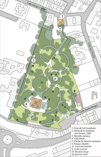 Por otro lado, en los entornos del parque encontramos también zonas de interés arqueológico, en la calle de San Nicolás número tres se encuentra el yacimiento de las piletas de salazón romanas de Iulia Traducta,[5] en el Hotel Cristina se encuentran los restos de una antigua mezquita del siglo IX y restos de la torres de flanqueo de la Villa Vieja en la cercana Huerta del Carmen.[6]