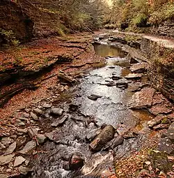 Uno de esos valles colgantes, con vistas al extremo sur del valle del lago Seneca, se convirtió en el profundo desfiladero de Watkins Glen. La empinada caída del arroyo Glen en el valle Seneca creó un poderoso torrente que erosionó la roca subyacente, tallando cada vez más el cauce hacia las cabeceras del arroyo. Esa erosión no fue un proceso uniforme: la roca en el lugar comprende shale, piedra caliza y areniscas, y esos tipos de roca se erosionan a diferentes velocidades, dejando atrás una escalera de cascadas, caídas, pozas y marmitas. El parque estatal Watkins Glen protege abarca diecinueve cascadas espaciadas a lo largo de un sendero de aproximadamente 3,2 km de longitud.[7]
