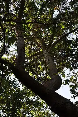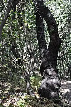 - Principalmente localizado en las laderas suroeste y oeste del cerro La Campana y del Cajón Grande, en pendientes variables y en altitudes de entre 350 y 1000 m s. n. m. Se trata de zonas con luz, pero baja incidencia de radiación solar directa, al tiempo que la humedad necesaria para esta vegetación se ve favorecida por las neblinas costeras. El bosque se compone principalmente de árboles perennes. La población arbustiva es, en cambio, más bien escasa y en el estrato herbáceo hay gran cantidad de helechos y enredaderas, donde destaca la presencia de parrilla blanca (Proustia pyrifolia). Dentro de la misma comunidad vegetal se han clasificado dos variantes: una que integra al matorral de Retanilla trinervia y de Gochnatia foliolosa con Solenomelus pedunculatus, y una variante que incorpora, en las condiciones de mayor humedad del sector de Ocoa, a Jubaea chilensis, conformando el denominado «bosque esclerófilo de peumo y boldo con palma chilena».[43]