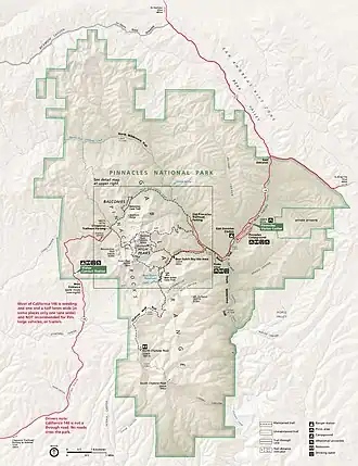 El parque nacional se encuentra dividido en un sector este y otro oeste mediante formaciones rocosas, ambos sectores están interconectados por sendas peatonales; pero no existe un camino interno para vehículos entre ambos sectores del parque. La porción este posee sombra y agua, mientras que la oeste se caracteriza por sus elevadas paredes de roca. Las formaciones rocosas forman elevadas agujas que atraen a numerosos escaladores. El parque posee varias cavernas que sirven de hogar para más de trece especies de murciélagos. A causa del intenso calor veraniego, los visitantes prefieren visitar Pinnacles durante la primavera o el otoño. En el parque moran numerosos halcones mexicanos, y dentro del mismo se han realizado sueltas de cóndores de California que habían sido criados en cautividad.