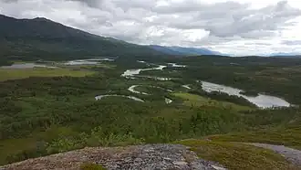 Vádvečohkka (derecha) y el profundo valle de Vádvejohka visto desde el sur en abril. -