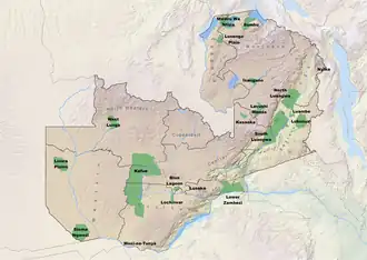 En Zambia hay 20 parques nacionales, entre 635 zonas protegidas que cubren unos 286.161 km², el 37,87 por ciento de su superficie, repartidas entre los 20 parques nacionales, 555 reservas forestales, 16 monumentos naturales, 1 área de conservación, 34 áreas de gestión de caza y 1 santuario de aves. A esto habría que añadir 1 sitio patrimonio de la Humanidad y 8 sitios Ramsar, humedales importantes por las aves.[1] En 2015, el presidente Edgar Lungu añadió el parque nacional de Lusaka, cercano a la capital.[2]