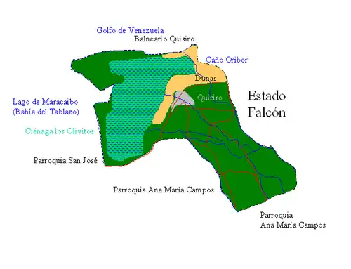 La parroquia Faría se encuentra en el extremo norte de la Costa Oriental del Lago de Maracaibo, en su parte norte se encuentra un desierto de dunas y la ciénaga de los olivitos un refugio de fauna silvestre. Este último es hogar de los flamingos rosados, que migran estacionalmente a Aruba y Curazao.