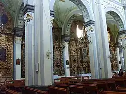 El interior es de tres naves y está precedida por un vestíbulo que formó parte de la mencionada iglesia anterior edificada en 1595. Sobre los muros de las naves procesionales destacan ocho grandiosos retablos barroco-churriguerescos dorados que contrastan con el estilo neoclásico del altar mayor. La sacristía es quizá la más bella de Puebla, por su arquitectura y aderezado de muebles como la cajonera taraceada y sus cuadros de renombrados pintores poblanos.