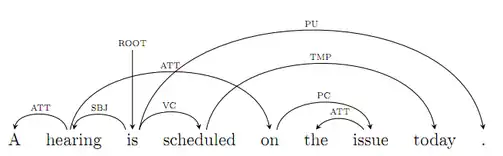 Otro método para realizar análisis sintáctico o parsing es utilizando gramáticas de dependencias, que surgen como una alternativa a las estructuras de frases.[3] En términos generales estas gramáticas definen una relación de dependencia entre cada elemento de una construcción (por lo general son oraciones pero también pueden ser solo frases) y su "cabeza" (o head ).[4] Estos elementos pueden ser palabras, tokens, lemas o incluso signos de puntuación. Adicionalmente se denomina a un elemento 0 o "raíz" (root) a la cabeza del constituyente principal, generalmente el verbo principal de la oración. Es importante no confundir dependencias con constituyentes, ya que las relaciones de dependencia generan pares únicos y ordenados.