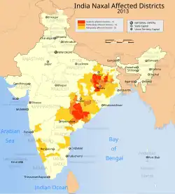 En 2006, el primer ministro indio Manmohan Singh se refirió a los naxalitas como "la mayor amenaza interna por sí sola a la seguridad" para India, y dijo que "las secciones más míseras y alienadas de la población" forman la espina dorsal del movimiento maoísta en India. Oficiales del Gobierno indio declararon que, en 2013, hasta 76 distritos del país se encontraban afectados por "terrorismo de izquierda", con otros 106 distritos en "influencia ideológica".