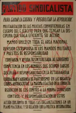 La CNT fue escéptica ante el Partido Sindicalista. El partido, minoritario respecto a la formación anarcosindicalista, dependía de varias células en Madrid, Andalucía, Cataluña, Aragón y Valencia. El PS publicó un periódico llamado El Pueblo. La federación catalana elaboró otro llamado Hora Sindicalista entre 1936 y 1937 y luego Mañana hasta enero de 1939. El ala juvenil se organizaba en torno a las Juventudes Sindicalistas. El capitán republicano de artillería Eduardo Medrano Rivas fue secretario del partido.[3]