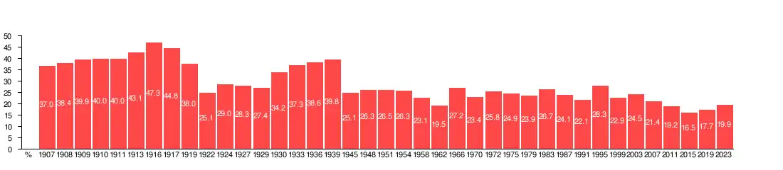 Ha participado en el gobierno por largos periodos de tiempo, hasta 1991 fue la fuerza más votada.[7] Ideológicamente, el partido se sitúa en una posición más moderada que el otro partido de izquierda del país, la Alianza de la Izquierda.