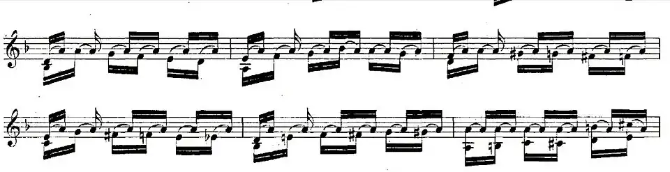 Posteriormente, Bach realiza una variación de lo anterior, ahora utilizando solo semicorcheas. En el compás 39 parece haber llegado a Sol M, pero lo oscurece con el Napolitano. En el compás siguiente, del mismo modo, oscurece la Dominante y en siguiente oscurece el bajo en la que sería la décima variación.