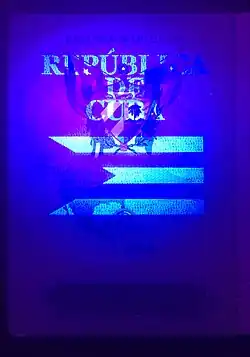 Además de contener fibras fluorescentes en todas las páginas comunes, los pasaportes cubanos cuentan con una marca visible bajo luz ultravioleta de la bandera de Cuba y las palabras República de Cuba en ambas guardas.