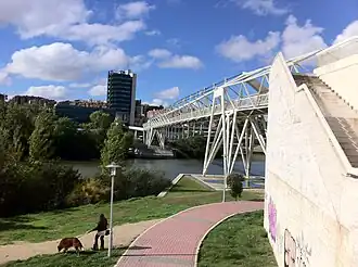 Pasarela peatonal vista desde la ribera izquierda del Pisuerga en el año 2013. Al fondo el museo de la Ciencia. | ||