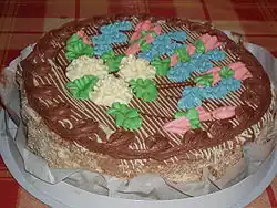 El pastel tiene dos capas aireadas de merengue con avellanas, glaseado de chocolate y un relleno similar a la crema de mantequilla.[3]