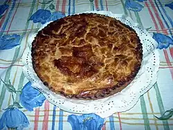 Consta de una masa de harina de trigo realizada con manteca y huevo, algo sazonada y bastante azucarada, rellena de carne de ave cocida y huevo duro. Se prepara con forma circular, con un diámetro de 25 a 40 cm., y se suele presentar en porciones. Es un plato contundente que se suele servir tibio o frío como entrante en la comida, o para el almuerzo o la merienda, además se suele consumir en excursiones o acampadas al no necesitar preparación y conservarse bastante bien.