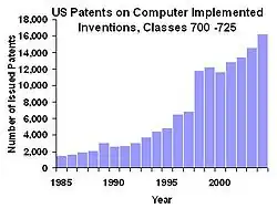 Las patentes de software son títulos que reconocen el derecho de explotar en exclusiva durante 20 años funcionalidades, algoritmos, representaciones y otras acciones que se pueden llevar a cabo con una computadora y que conceden algunas oficinas de patentes en el mundo. En la jerga se suele sustituir dicho término por la expresión "invención implementada por computadora" que incluye tanto las polémicas patentes de software como las generalmente aceptadas "invenciones por computadora", esto es, las invenciones físicas tradicionales que incluyen software en su funcionamiento. Así, la Oficina Europea de Patentes (OEP) define generalmente una invención implementada en computadora como "expresión destinada a cubrir solicitudes que involucren computadoras, redes informáticas u otros aparatos programables convencionales por las características novedosas de la invención apropiada se manifiesten a través de uno o varios programas."[1]