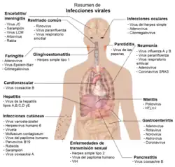 Los virus replicados deben diseminarse a los órganos diana (sitios de la enfermedad) por todo el cuerpo. La vía de diseminación más frecuente desde la puerta de entrada es el sistema circulatorio, al cual accede el virus por el sistema linfático. Los virus pueden acceder a los órganos diana desde los capilares sanguíneos mediante su multiplicación dentro de las células endoteliales, en las que entran a través de huecos, o por ser transportado dentro del órgano en los leucocitos. Algunos virus, como el del herpes, el de la rabia y el de la poliomielitis, también pueden diseminarse a través de los nervios.