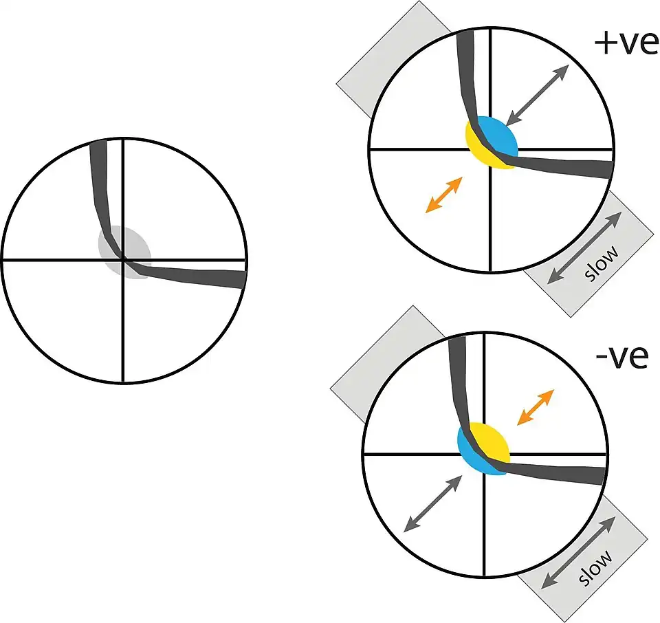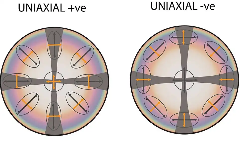 La visualización de la figura de interferencia es una manera segura para determinar si un mineral es ópticamente uniaxial[Nota 1] o biaxial[Nota 2]. Si la figura está alineada correctamente, el uso de una lámina de tinta sensible con el microscopio permite al usuario determinar la señal óptica y el ángulo óptico del mineral.