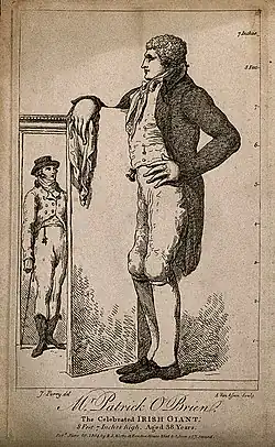En abril de 1782 llegó a Londres para exhibirse Charles Byrne, supuestamente de 2,50 m. Exámenes posteriores de sus restos descubrieron que en realidad medía 2,31 m. Llamó la atención de inmediato, como informó un diario londinense en un artículo del 6 de mayo de 1782: "Aunque es fácil atraer la curiosidad, generalmente cuesta más captar la atención del público; pero este no es el caso del moderno Coloso viviente, el maravilloso gigante irlandés. Tan pronto como llegó a un elegante apartamento en Spring Garden, puerta con puerta con el Museo Cox, curiosos de todo tipo acudieron a verlo, siendo conscientes de que un prodigio como este nunca antes había aparecido entre nosotros (...)".