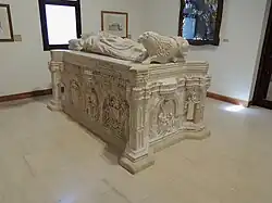 - El sepulcro del cardenal Francisco Jiménez de Cisneros está situado en el presbiterio de la capilla de San Ildefonso, aunque sus restos mortales permanecen en la Catedral Magistral. A la tumba del cardenal Cisneros se la considera una "joya del arte funerario renacentista". Diseñada en 1518 por Domenico Fancelli, fue realizada en mármol de Carrara por Bartolomé Ordóñez tras de la muerte de Fancelli, en 1519. Ordóñez también falleció cuando estaba a punto de finalizar la obra, en 1520, de tal forma que algunas figuras y los últimos detalles fueron culminados por sus discípulos en 1521.[58]
