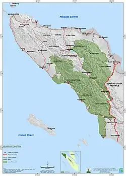 El parque nacional Gunung Leuser (PNGL) en el norte de la isla tiene 150 km de largo, más de 100 km de ancho y es principalmente montañoso. El 40% del parque es empinado y supera los 1.500 m. Solo el 12% del parque, en la mitad sur inferior, está por debajo de los 600 metros, pero durante 25 km corre por la costa. Once picos superan los 2.700 my el punto más alto es Gunung Leuser que alcanza los 3.466 metros. El área que rodea a Gunung Leuser se conoce como el ecosistema de Leuser .