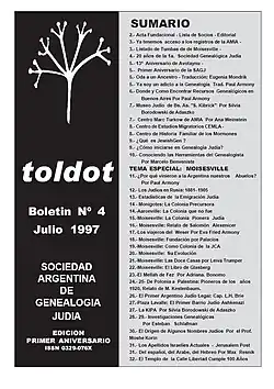 - ↑ a b c d «Toldot, la publicación de AGJA. Tapas de las publicaciones, y los sumarios correspondientes:».