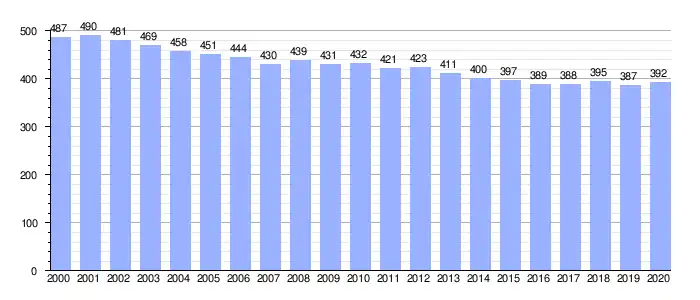 | Gráfica de evolución demográfica de Peón[3] entre 2000 y 2020 |