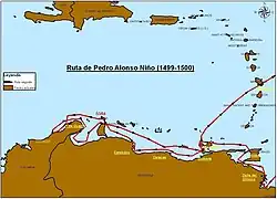 - ↑ http://www.biografica.info/biografia-de-nino-pedro-alonso-1814...en 1499, emprendió una expedición particular al mando de una carabela, en colaboración con Cristóbal Guerra, que le llevó a seguir la ruta de Ojeda hacia la Isla Margarita, para continuar hasta Cumaná.