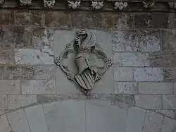 Escudo de armas de Pere el Cerimoniós, con el dragón alado sobre la corona y el yelmo. Relieve de las Torres de Serranos de Valencia.