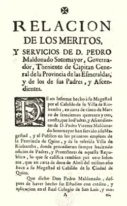 - Relación de los méritos y servicios de D. P. Maldonado Sotomayor, Gobernador de la provincia de las Esmeraldas