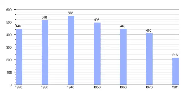 | Gráfica de evolución demográfica de Pedrosa del Rey[9] entre 1920 y 1981 |