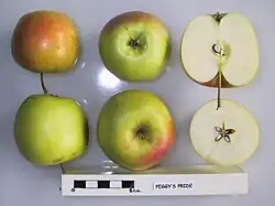 - ↑ a b c d e La manzana 'Peggy's Pride' en el "National fruit collection.org.uk". Consultado el 25 de enero de 2021.