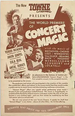 La película de concierto más antigua conocida es la imagen de 1948, Concert Magic. Este concierto cuenta con el virtuoso violinista Yehudi Menuhin (1916-1999) en los estudios Charlie Chaplin en 1947. Junto con varios artistas, interpretó obras clásicas y románticas de compositores famosos como Beethoven, Wieniawski, Bach, Paganini y otros.