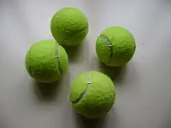 Una pelota de tenis es un objeto esférico de pequeño diámetro (especialmente en comparación con la medida de otras pelotas) que se utiliza en la práctica del deporte homónimo. Para impulsarla se utiliza una raqueta. Un profesional puede hacer que llegue a coger una velocidad de 263 km/h. Se recubre con fieltro (en general de color amarillo fluorescente con rayas de separación blancas), puesto que es el «color más visible por el ojo humano» y permite una trayectoria más correcta, en comparación con una totalmente lisa.[1] De media, una pelota de tenis pesa de 56 a 58 gramos.[2][3]