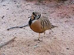 Es poco probable que sea confundido con cualquier otra especie cuando se encuentran en su hábitat natural.[8] Sus partes superiores son de un rico color ante arenoso, moteado de marrón oscuro. Tiene una banda negra en la corona que se extiende de ojo a ojo. La cara, las coberteras auriculares y el cuello son de color blanco, al igual que la cloaca. Una amplia banda negra en forma de Y se extiende desde la parte posterior del cuello hacia abajo por los lados del cuello a través del pecho hasta el centro del vientre. Las piernas son de un color beige pálido, con las patas notablemente más oscuras. Los ojos son de color marrón oscuro. Los machos y las hembras son similares en apariencia.[7][8][9] Maclean observed that that birds moulted into a paler, less bold non-breading plumage.[5] Las aves inmaduras carecen de las marcas de color negro en la cabeza, el cuello y el pecho de los adultos.[5] Las llamadas son poco frecuentes, a menudo un corto gutural kroot o krrr cuando toma el vuelo.[5][9][10]