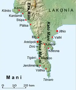 - ↑ «Mani - Kato Mani - from Kelefa to Vardounia and on to Githeon». www.zorbas.de.