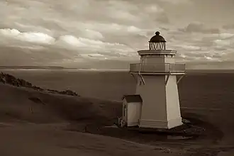 ![]() El faro de Kaipara North Head situado en la península de Pouto se construyó en 1884 en respuesta a la continua pérdida de barcos y vidas. Torre de madera de 13,4 m. Última torre de madera construida en Nueva Zelanda. | ||