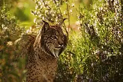 Entre los grandes carnívoros destacan dos especies desaparecidas de buena parte de la Europa occidental: el oso pardo, que sobrevive en la Cordillera cantábrica y en ciertos enclaves pirenaicos, y el lobo ibérico, subespecie endémica de la península ibérica. Aunque el carnívoro más emblemático es sin duda el lince ibérico, el félido más amenazado de todo el continente europeo. Mucho más numerosas son las poblaciones de gato montés, de zorro rojo y las de algunos mustélidos: el tejón, el turón y la comadreja; algo menos numerosas son las de nutria, marta y garduña. Los vivérridos están representados por la jineta; y los herpéstidos, por el meloncillo.