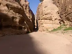 También es posible caminar por el sendero de 6 kilómetros desde el final del cañón hasta Deir en Petra.[8] Se recomienda a los que hacen el viaje que lo hagan con un guía, ya que el camino, aunque es obvio en muchos lugares, no está marcado formalmente. Se advierte a los excursionistas que no intenten el sendero por su cuenta o al final del día, ya que las noches en la región a menudo son frías. También está prohibido ingresar en Petra sin haber pagado la admisión del sitio más grande.[5]