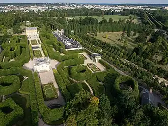 Tras la muerte de su abuelo, Luis XVI ofreció el Pequeño Trianón a su joven esposa María Antonieta, que creó un universo personal e íntimo, lejos de los fastos de la corte. Ella hizo construir un teatro y después hizo convertir el jardín botánico en un jardín de estilo inglés, en contraste con la monotonía del resto del parque de Versalles. Richard Mique levantó más construcciones en los contornos sinuosos de caminos y de un arroyo entre 1777 y 1782: el Templo del Amor, un “jardín alpino” con su belvedere y un campo de juegos ecuestres. En un estilo más rústico, una aldea venía a completar el conjunto, según la inspiración rousseista del pintor Hubert Robert.