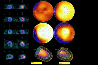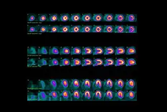 - Defecto reversible: Alteración perfusoria dada por menor captación (concentración) en una región del ventrículo izquierdo que aparece durante la fase de estrés pero que mejora o incluso se normaliza durante la fase de reposo, a esto se le denomina isquemia.