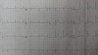 Electrocardiograma de paciente con pericarditis. Se pueden observar supradesniveles del segmento ST en casi todas las derivaciones, con onda recíproca en aVR. | ||