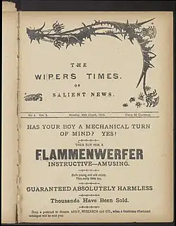 Un periódico de trinchera o periódico del frente es un tipo de publicación periódica creada por y para soldados y oficiales durante la Primera Guerra Mundial, surgida inicialmente en el contexto de la guerra de trincheras tras el estancamiento del frente en 1914-1915. El término «periódico de frente» se asocia principalmente a las publicaciones belgas y flamencas, mientras que «periódico de trinchera» es de uso común para las italianas y francesas. Estas publicaciones servían para informar, entretener y mantener la moral de las tropas, diferenciándose de las producciones oficiales al ser elaboradas directamente en las primeras líneas o por civiles cercanos al frente.[1] Su diversidad fue amplia, abarcando desde periódicos de heridos y prisioneros hasta publicaciones de unidades en frentes como Oriente o Italia, así como de marineros, aviadores y artilleros. Fueron característicos de los ejércitos aliados (Francia, Reino Unido, Bélgica e Italia), mientras que en los Imperios Centrales se desarrolló una «prensa del frente» más institucional, impulsada por los estados mayores alemanes y austriacos.[2]