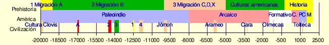 - Paleoindio : (17000 a. C. – 7000 a. C): los pobladores eran nómadas y estaban organizados en bandas. Habitaban en refugios rocosos y dominaban el fuego. Se alimentaban de frutos y animales. Elaboraban herramientas de piedras y hueso. Los hallazgos arqueológicos más antiguos han sido encontrados en los abrigos rocosos de Chiribiquete, donde fueron datadas pictografías rupestres de hasta 19.510 años antes del presente.[1] En Pubenza (Tocaima, Cundinamarca) se encontraron ocho artefactos en una capa estratigráfica fechada en 16.400 años AP.[5] En el sitio El Jordán, Roncesvalles (Tolima), la presencia humana ha sido fechada en 12.900 años AP.[6] En los abrigos rocosos del El Abra, al oriente de Zipaquirá, en la Sabana de Bogotá se encontraron instrumentos líticos en 1967, datados del 10.460 a. C. ± 160.[7] Otros hallazgos del Paleoindio se han hecho en Tibitó, Tequendama (Cundinamarca), Puerto Nare (Antioquía), San Isidro (Popayán) La Palestina (Yondó) y La Morena (Medellín).[8] Estos hallazgos en el interior del país significan que las migraciones paleoindias llegaron a Sudamérica con años de anterioridad a las fechas hasta ahora registradas.