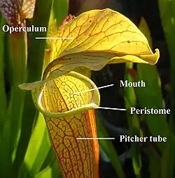 En plantas con trompetas, el peristoma es un anillo de reflejos (o anillo parcial) de tejido que rodea la entrada al tubo digestivo de estas plantas. A menudo (por ejemplo en Cephalotus) posee fuertes y dominantes 'dientes' que le ayudan a retener la presa. A menudo es salpicada con glándulas secretoras de néctar, de ahí su nombre popular, rollo de néctar.
